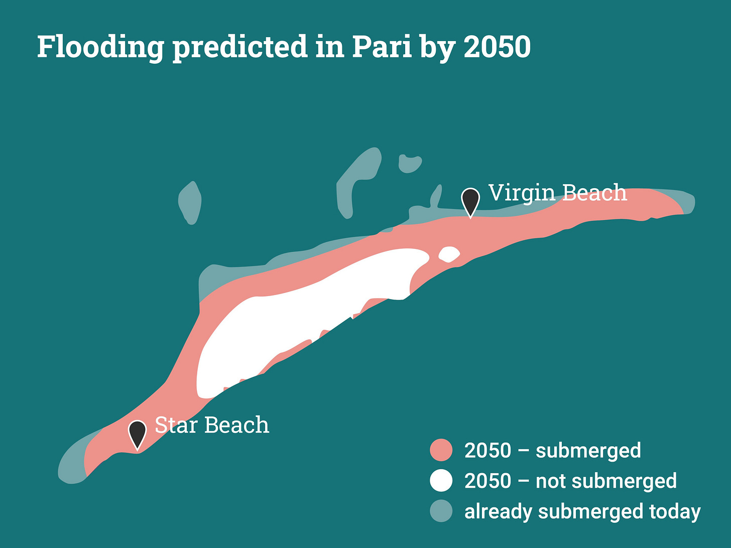 The island of Pari, located off the northern shore of Jakarta, Indonesia in an archipelago known as the Thousand Islands, features beautiful yet fragile ecosystems including beaches, mangrove forests, and coral reefs. Like many similarly situated small islands, it is especially vulnerable to sea level rise and already experiences more frequent and damaging flood events. By 2050, much of the island could be permanently submerged, threatening the homes and livelihoods of the island’s 1,500 inhabitants.