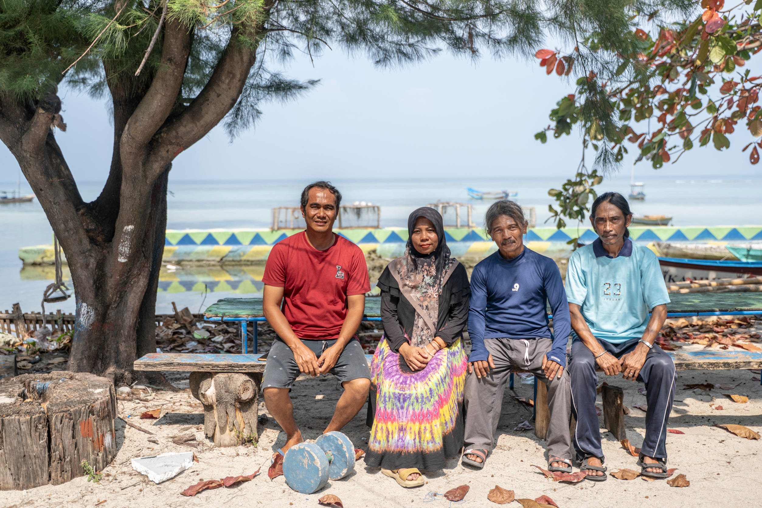 The Pari Island plaintiffs who are taking the Swiss cement company Holcim to court in a landmark climate lawsuit. From left to right: Edi Mulyono, Asmania, Mustaghfirin (Pak Bobby), Arif Pujiyanto. Credit: Photo courtesy of HEKS